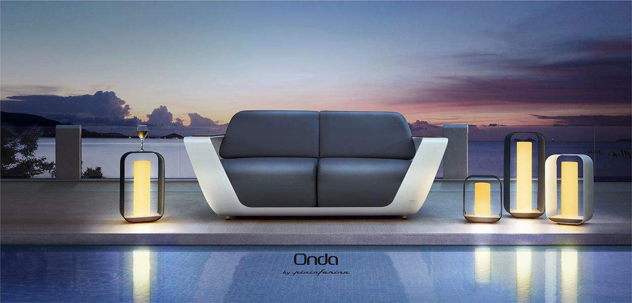Being conceived for the outdoor furniture, the Pininfarina design team took the inspiration from the dynamism, elegance and purity of the ocean waves, the empty space that is created when a wave is broken, resulting in to a hollow or tube wave (Onda in Italian). The heart of the collection is the structure, an aluminum band sustaining the cushions and becoming the iconic element of the whole Collection.